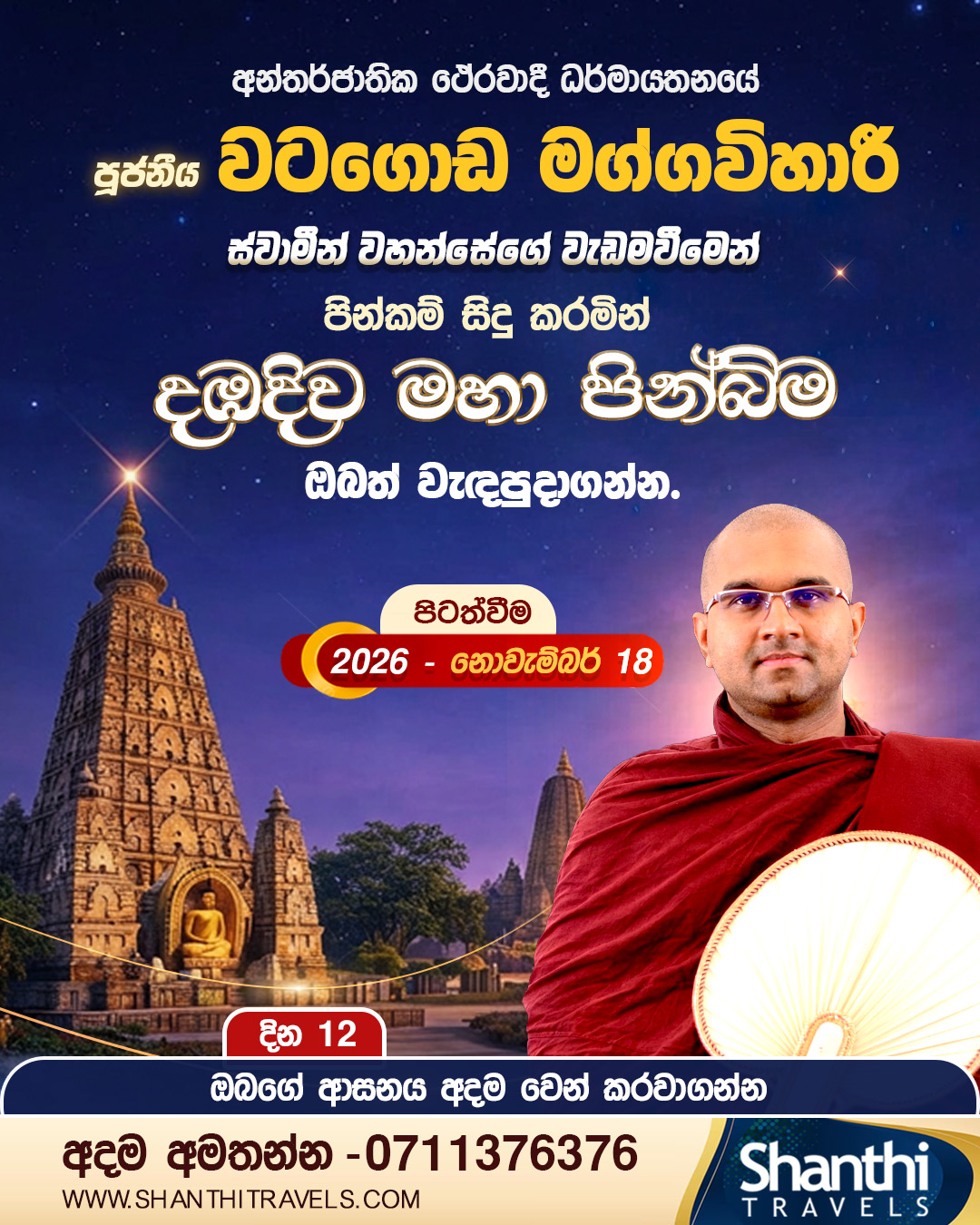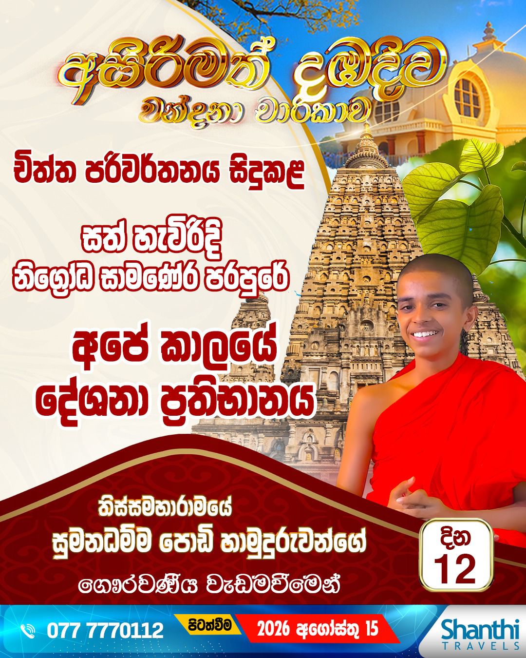 GOOD Based on 77 reviews Posted on Priyanthi WijesooriyaTrustindex verifies that the original source of the review is Google. Superb organisation and well guided us trough out the tour.arranged Very good Hotels for the accommodation.The thero who explained about places and everything clearly and kindly.Posted on Diyuni JayodaTrustindex verifies that the original source of the review is Google. I had the wonderful opportunity to take part in the Dambadiwa Wandana with my parents on 18th October 2025 through Shanthi Travels. It was a 14-day tour with a group of 40 people, and Shanthi Travels took excellent care of every member from the moment we began the airport process. The entire journey was truly memorable and deeply blessed. We were able to worship many sacred Buddhist pilgrimage sites—including Lumbini, Buddhagaya Viharaya, and Jethawanaramaya—guided with great care and wisdom by Thissa Thero. The most meaningful moments for me were observing sil at the sacred Buddhagaya Viharaya, having the opportunity to worship and witness the Sacred Relics of the Buddha with my own eyes, and worshiping the Sanchi Stupa and Jethawanaramaya with clear and insightful guidance. From various religious observances—such as Sangha Dana, Atapirikara Puja, Chivara Puja, and Kiripidu Puja—to learning the ancient significance of each holy site, every experience felt special and enriching. All the facilities provided by Shanthi Travels throughout the tour—hotel stays, bus travel, and train arrangements—were well organized and comfortable, allowing us to worship with a peaceful and stress-free mind. I highly recommend Shanthi Travels to anyone wishing to visit the Buddhabhumi and experience a truly meaningful and unforgettable pilgrimage.Posted on NalinsraTrustindex verifies that the original source of the review is Google. My wife and I traveled from the U.S. to Sri Lanka to join the recent 11-day VIP tour organized by Shanthi Travels for දඹදිව චරිකා (October 12–22, 2025). From the very beginning, the team at Shanthi Travels impressed us with their professionalism providing detailed pre-tour information and being available even on Saturdays to answer our questions. Our group was small (17 participants), yet we were provided with a spacious 45-seater air-conditioned Volvo bus, a skilled driver, and a helpful assistant. The tour was led by Venerable Mapane Sumanadhamma Thero, a knowledgeable and patient Buddhist monk who guided us with deep insights into Buddhist history and sacred sites. His ability to connect with people of all ages and backgrounds made the experience truly special. We also had the support of Lakshman, a local Indian tour assistant fluent in Sinhala. His care and attention especially during border crossings between Nepal and India were invaluable. Meals were mostly buffet-style at 4-star or higher hotels, and accommodations were consistently comfortable and air-conditioned. Many of the hotels belonged to the Residency and Radisson groups in India. This review is entirely voluntary no one asked or paid me to write it. I’m simply grateful for the exceptional service and unforgettable experience Shanthi Travels provided. I highly recommend Shanthi Travels to anyone planning a pilgrimage to දඹදිව. Their service and attention to detail make the journey truly meaningful." මගේ බිරිඳ සහ මම එක්සත් ජනපදයෙන් ශ්රී ලංකාවට පැමිණියේ දඹදිව චරිකා සඳහා (2025 ඔක්තෝබර් 12 සිට 22 දක්වා) ශාන්ති ට්රැවල්ස් ආයතනය විසින් සංවිධානය කළ 11 දිනක විශේෂ (VIP) චාරිකාවට එක්වීමටය. ආරම්භයේ සිටම ශාන්ති ට්රැවල්ස් කණ්ඩායම අපව වෘත්තීයමය ආකාරයෙන් ආකර්ෂණය කළ අතර, චාරිකාවට පෙර විස්තරාත්මක තොරතුරු ලබාදීමත්, සෙනසුරාදා දිනවලටවත් අපගේ ප්රශ්නවලට පිළිතුරු දීමට සූදානම්ව සිටීමත් ඔවුන්ගේ කැපවීම පෙන්වා දුන්නාය. අපගේ කණ්ඩායම සාපේක්ෂව කුඩා (17 දෙනෙකු) වූ නමුත්, අපට වායු සමීකෘත ආසන 45ක් සහිත විශාල වෝල්වෝ බස් රථයක්, දක්ෂ රියදුරෙකු සහ උදව්කාරකයෙකු ලබාදී තිබුණි. චාරිකාව මෙහෙයවූයේ ගරු මාපානේ සුමනධම්ම හිමියන් වන අතර, බුද්ධ ධර්මය පිළිබඳ ගැඹුරු දැනුමක් සහිත, ශාන්තිමත් භික්ෂුවෙකි. සියලු වයස් සහ විවිධ පසුබිම් වලින් පැමිණි පුද්ගලයන් සමඟ සම්බන්ධ වීමට ඔහුට තිබූ හැකියාව මෙම අත්දැකීම විශේෂත්වයකින් යුතුව කළේය. අපට සහය වූයේ ඉන්දියාවේ සිට පැමිණි, සිංහල භාෂාවට දක්ෂ ලක්ෂ්මන් නම් චාරිකා උදව්කාරයෙකි. විශේෂයෙන් නේපාලය සහ ඉන්දියාව අතර සීමා හරහා ගමන් කිරීමේදී ඔහුගේ සැලකිල්ල සහ අවධානය අතිශය වටිනා විය. ආහාර බොහෝවිට තරු 4ක් හෝ ඊට වැඩ